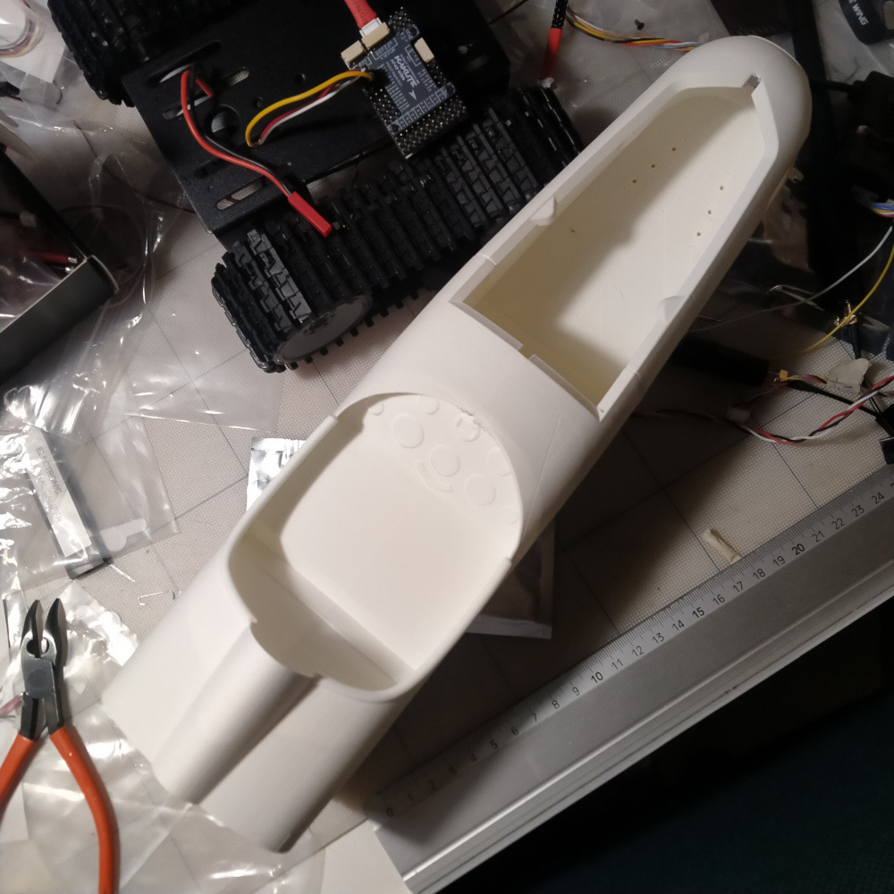 Otro problema con las piezas, en especial con el filamento de eSun LW-PLA es el color. Es un color blanco no puro, con una ligera tonalidad amarillenta y no es opaco, hasta el punto que se aprecia la estructura interior sin que le pase luz a través. Válido para cualquier avión, pero no para una maqueta. En las piezas impresas se aprecian impurezas con apariencia de pequeñas ramitas amarillentas. Normalmente son superficiales y se retiran a mano, pero alguna ha quedado incrustada en la pared como un nódulo y es imposible retirarla sin estropear la pieza. Al menos se puede lijar aunque no se disimula del todo.