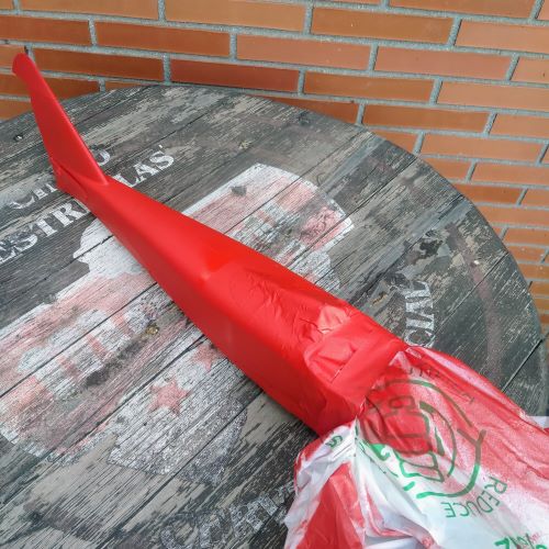 El siguiente reto fue enmascarar para proteger la pintura del siguiente color. Usé cinta de papel típica de pintores. Un asco. Es prácticamente imposible darle una forma curva y además la adherencia al LW-PLA es mala. Use pintura de Montana Colors, el rojo sangre que se parece bastante al rojo de la decoración más conocida del Fly Baby.